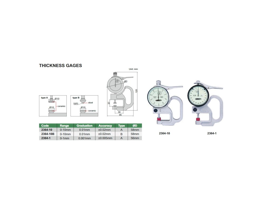 Analoger Dickenmesser 0-10/0,01 mm, Typ B - Messflächen stahl, ballig/keramisch flach, INSIZE 2364-10B